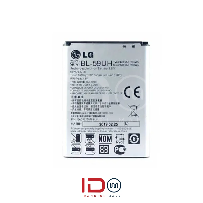 باتری اورجینال گوشی الجی مدل LG G2 Mini با یک سال گارانتی بی قید و شرط با مدل BL-59UH شناخته می‌شود و از نوع لیتیوم‌یونی است. ظرفیت این باتری 2440 میلی‌آمپر ساعت بوده و به‌صورت کاملاً جداشدنی طراحی شده است، بنابراین کاربران می‌توانند به راحتی باتری را تعویض کنند. این باتری از فناوری شارژ سریع و شارژ بی‌سیم پشتیبانی نمی‌کند، اما با شارژر اصلی گوشی ال‌جی بیشترین بازدهی را ارائه می‌دهد.