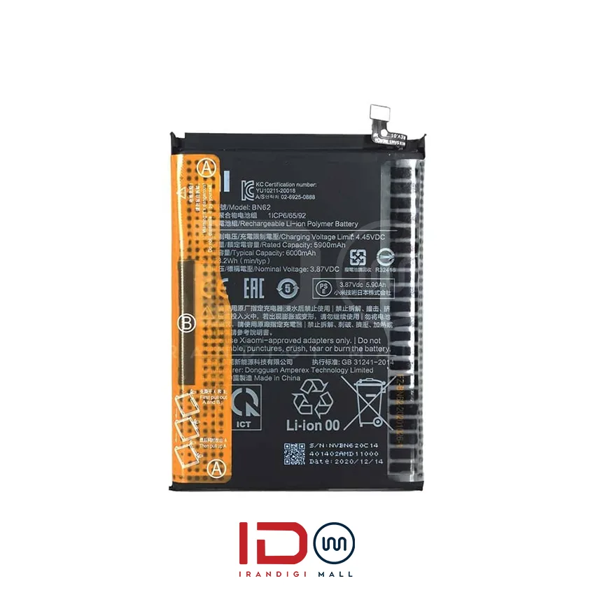 باتری اورجینال شیائومی Redmi 9T مدل BN62 از نوع لیتیوم-یونی (Li-Ion) با ظرفیت ۶۰۰۰ میلی‌آمپر ساعت است. این ظرفیت بالای باتری به کاربران این امکان را می‌دهد که از گوشی خود برای مدت طولانی‌تری استفاده کنند بدون نیاز به شارژ مکرر. ظرفیت بالای این باتری به‌ویژه برای کسانی که از گوشی خود برای فعالیت‌های سنگین مانند بازی، تماشای ویدئو و استفاده از برنامه‌های پردازشی بالا استفاده می‌کنند، مناسب است. این باتری به‌گونه‌ای طراحی شده که مصرف انرژی بهینه‌ای داشته و باعث افزایش طول عمر گوشی شود.