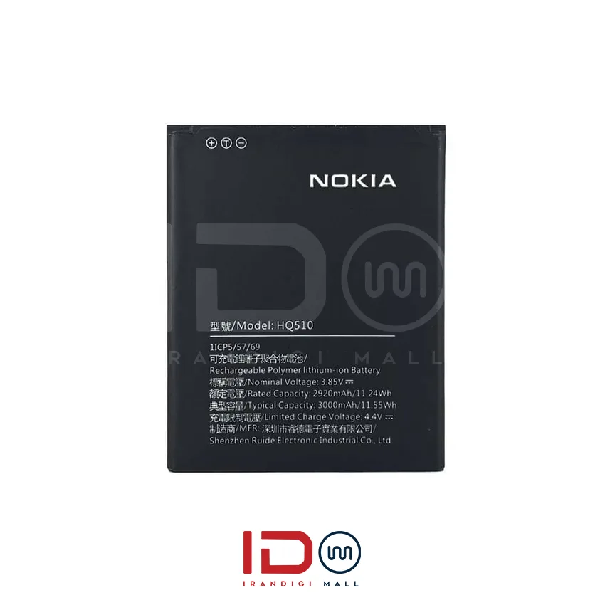 باتری HQ510 از فناوری لیتیوم-یونی (Li-Ion) استفاده میکند که باعث میشود عملکرد باتری بهصورت پایدار و با کارایی بالا باشد. ظرفیت این باتری 3000 میلیآمپر ساعت و ولتاژ خروجی 3.85 ولت است. این ویژگیها به گوشی نوکیا 2.2 اجازه میدهند تا انرژی کافی برای تماسهای طولانی، استفاده از اینترنت و اجرای برنامههای مختلف را تأمین کند.