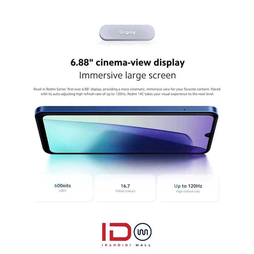 گوشی REDMI 14C دارای صفحه نمایش 6.71 اینچی با وضوح HD+ است که تصاویر، فیلم‌ها و متون را با وضوح بالا نمایش می‌دهد. اندازه بزرگ صفحه نمایش این گوشی به شما این امکان را می‌دهد که از مشاهده محتوا به راحتی لذت ببرید. این صفحه نمایش برای تماشای فیلم‌ها، بازی‌ها و استفاده از شبکه‌های اجتماعی بسیار مناسب است و تجربه‌ای واضح و دلپذیر از مشاهده محتوا را برای شما فراهم می‌آورد.