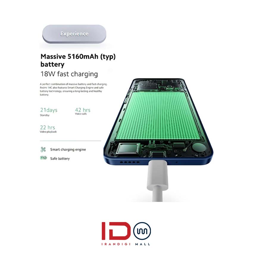 گوشی REDMI 14C مجهز به باتری 5000 میلی‌آمپر ساعت است که توانایی پشتیبانی از یک روز کامل استفاده را دارد. این باتری قدرتمند برای کسانی که به مدت طولانی از گوشی خود استفاده می‌کنند، گزینه‌ای عالی است. بدون نیاز به نگرانی در مورد شارژ مجدد مداوم، می‌توانید از گوشی خود در طول روز استفاده کنید و از ویژگی‌های آن بهره‌مند شوید.